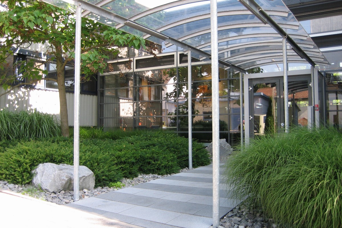 Der Eingangsbereich wird von einem großen Blauglockenbaum beschattet. Die organische Form der darunter gepflanzten geschnittenen Kisseneibe bringt viel Grün in die stark bebaute Fläche. Die Kisseneiben und Gräserfelder ziehen sich um die gesamten Gebäude des Betriebes herum. Die hohen Fassaden sind durch regelmäßig angeordnete Säulen-Hainbuchen gegliedert. Dadurch wirken sie nicht so massiv in dieser Umgebung.